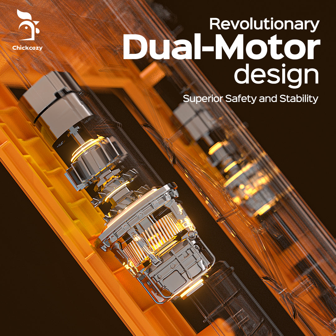 The Chickcozy solar-powered chicken coop door features an innovative dual-motor control design, where each motor independently controls one side of the door. This eliminates traditional transmission errors and ensures unmatched reliability. Like “1+1 > 2,” this design delivers exceptional strength and steadfast security, providing rock-solid protection against external forces.